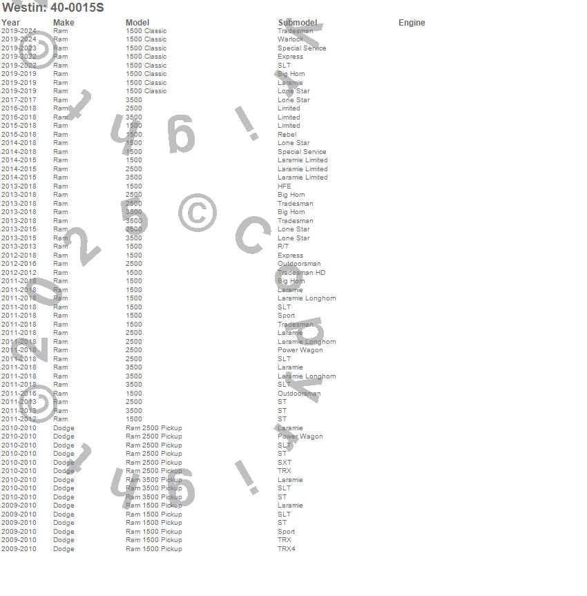 Below is an abbreviated list of applications for the Grille Guard Sensor Relocator.1500, 1500 Classic, 2500, 3500, Ram 1500, Ram 2500, Ram 3500, Dodge, Ram, 2024, 2023, 2022, 2021, 2020, 2019, 2018, 2017, 2016, 2015, 2014