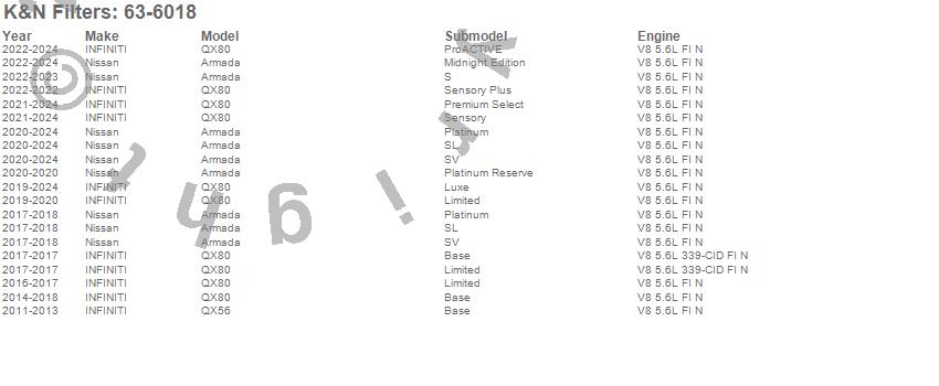 Below is an abbreviated list of applications for the 63 Series Aircharger Kit.Armada, QX56, QX80, Infiniti, Nissan, 2019, 2018, 2017, 2016, 2015, 2014, 2013, 2012, 2011