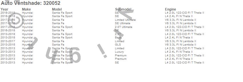 Below is an abbreviated list of applications for the Aeroskin Smoke Hood Protector.Santa Fe, Santa Fe Sport, Hyundai, 2018, 2017, 2016, 2015, 2014, 2013