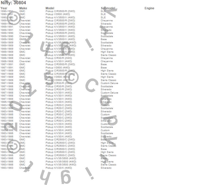 Below is an abbreviated list of applications for the Pro-Line Replacement Carpet.C20 Pickup, C2500 Pickup, C30 Pickup, C3500 Pickup, K20 Pickup, K30 Pickup, K3500 Pickup, R30 Pickup, R3500 Pickup, V30 Pickup, V3500 Pickup, Chevrolet, GMC, 1991, 1990, 1989, 1988, 1987, 1986, 1985
