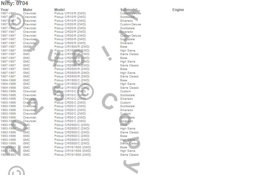Below is an abbreviated list of applications for the Pro-Line Replacement Carpet.C10 Pickup, C1500 Pickup, C20 Pickup, C2500 Pickup, C30 Pickup, C3500 Pickup, R10 Pickup, R1500 Pickup, R20 Pickup, R2500 Pickup, R30 Pickup, R3500 Pickup, Chevrolet, GMC, 1988, 1987, 1986, 1985, 1984, 1983