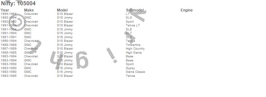 Below is an abbreviated list of applications for the Pro-Line Replacement Carpet.S10 Blazer, S15 Jimmy, Chevrolet, GMC, 1994, 1993, 1992, 1991, 1990, 1989, 1988, 1987, 1986, 1985, 1984, 1983
