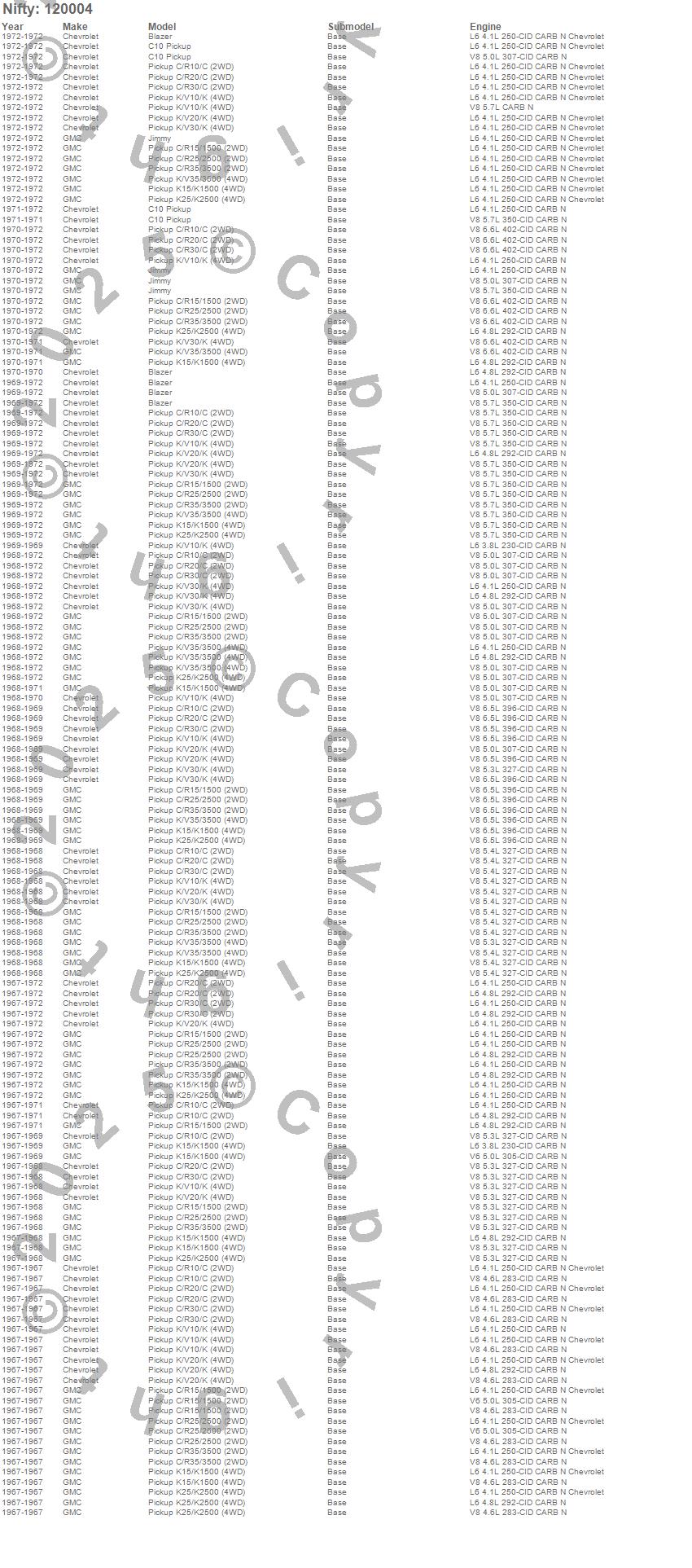 Below is an abbreviated list of applications for the Pro-Line Lower Door Panel Carpet.Blazer, C10 Pickup, C1500 Pickup, C20 Pickup, C25/C2500 Pickup, C30 Pickup, C35/C3500 Pickup, Jimmy, K10 Pickup, K15/K1500, K1500 Pickup, K20 Pickup, K25/K2500 Pickup, K30 Pickup, K35/K3500 Pickup, Chevrolet, GMC, 1972, 1971, 1970