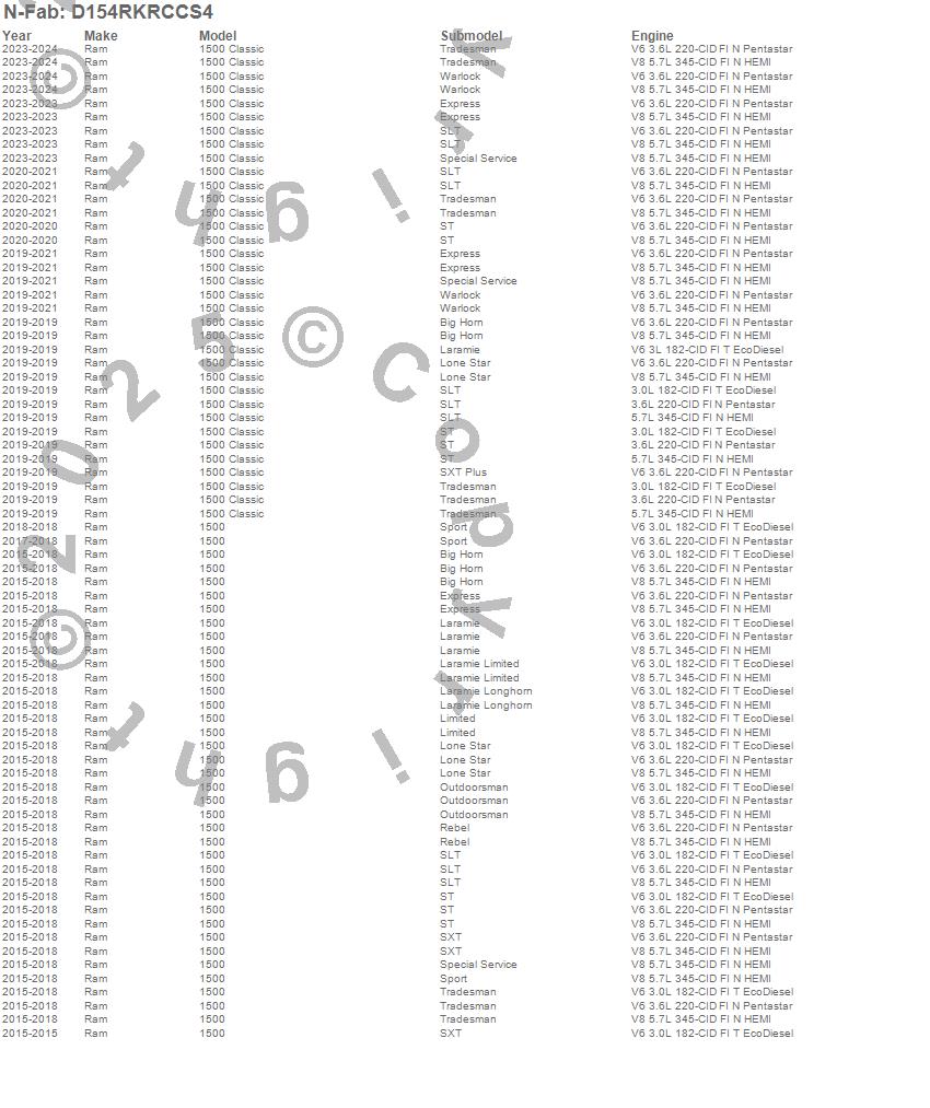 Below is an abbreviated list of applications for the RKR Cab Length Step System.1500, 1500 Classic, Ram, 2024, 2023, 2021, 2020, 2019, 2018, 2017, 2016, 2015