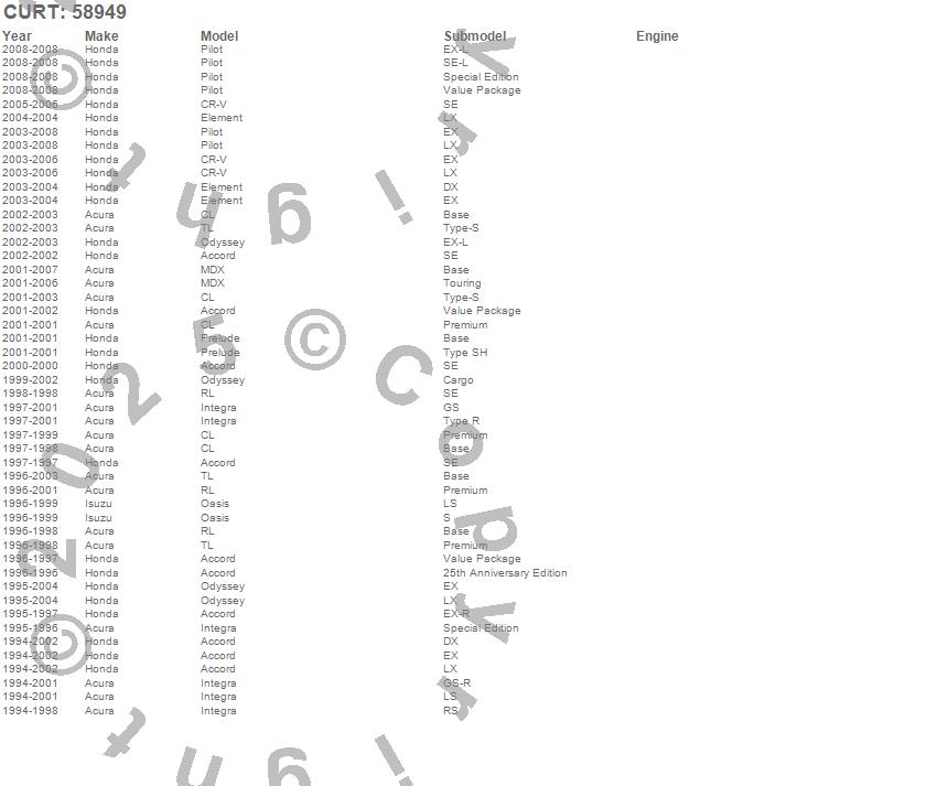 Below is an abbreviated list of applications for the Towed-Vehicle RV Harness.Accord, CL, CR-V, Element, Integra, MDX, Oasis, Odyssey, Pilot, Prelude, RL, TL, Acura, Honda, Isuzu, 2008, 2007, 2006, 2005, 2004
