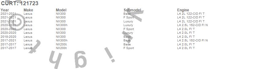 Below is an abbreviated list of applications for the Class II 1.25 in. Receiver Hitch.NX200t, NX300, NX300h, Lexus, 2021, 2020, 2019, 2018, 2017