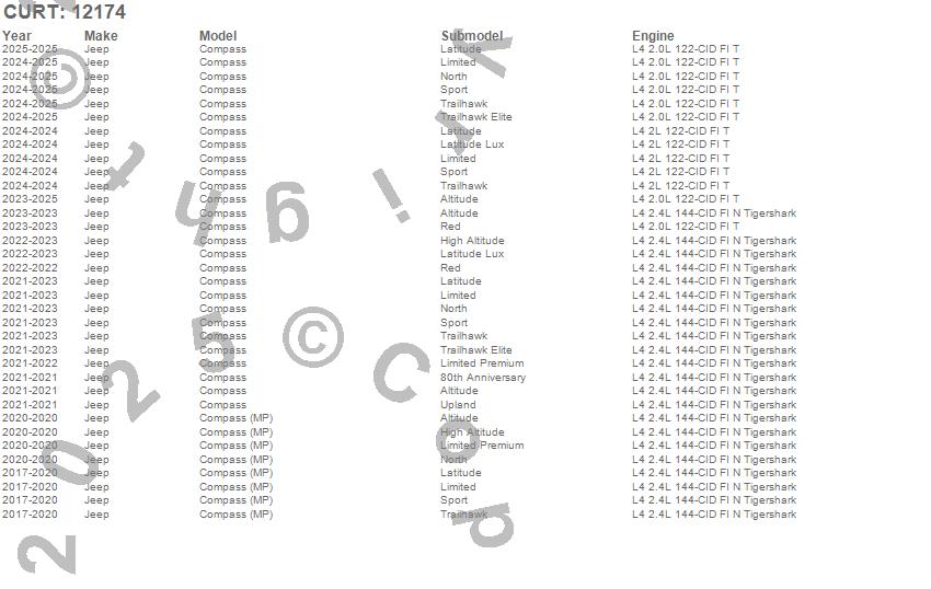 Below is an abbreviated list of applications for the Class II 1.25 in. Receiver Hitch.Compass, Jeep, 2025, 2024, 2023, 2022, 2021, 2020, 2019, 2018, 2017