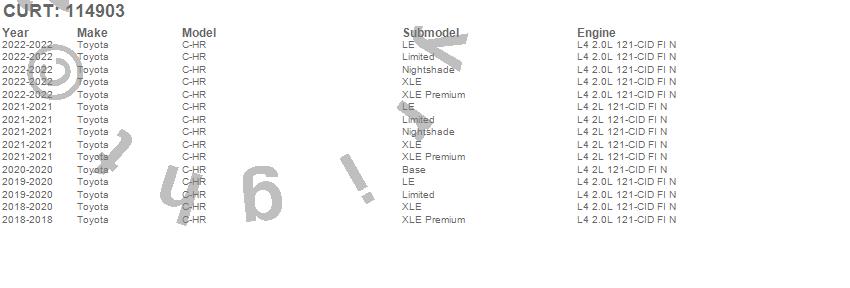 Brand: CURTPart Number: 114903Trailer Hitch Type: Incl. Std Ball Mount/Pin/Clip - Rear - 2000lbs. Gross Trailer Weight - 200 lbs. Tongue WeightUPC: 612314042982
