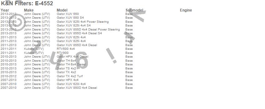 Below is an abbreviated list of applications for the Air Filter.Gator HPX 4x4, Gator HPX 4x4 Diesel, Gator TH 6x4, Gator TH 6x4 Diesel, Gator TS 4x2, Gator TX 4x2, Gator TX 4x2 Turf, Gator XUV 550, Gator XUV 550 S4, Gator XUV 620i 4x4, Gator XUV 625i 4x4, Gator XUV 825i 4x4, Gator XUV 825i 4x4 Power Steering, Gator XUV 825i 4x4 S4, Gator XUV 850D 4x4 Diesel, Gator XUV 855D 4x4 Diesel, Gator XUV 855D 4x4 Diesel Power Steering, Gator XUV 855D 4x4 Diesel S4, RTV500 4x4, RTV900