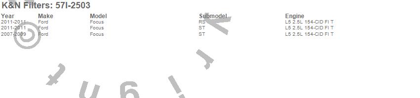 Brand: K&N FiltersPart Number: 57I-2503Air Intake Kit Type: Fits w/05-11 Ford Focus II/XR5 2.5L - Incl. Red Air Filter/Tubing/Adaptors/HardwareUPC: 024844183507