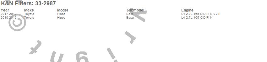 Below is an abbreviated list of applications for the Air Filter.Hiace, Toyota, 2017, 2016, 2015, 2014, 2013, 2012, 2011, 2010