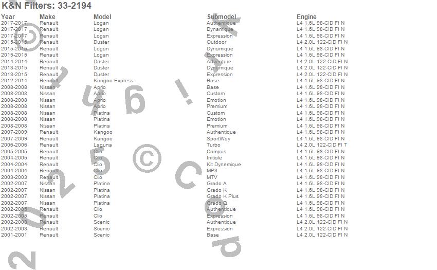 Below is an abbreviated list of applications for the Air Filter.Clio, Kangoo, Kangoo Express, Laguna, Scenic, Renault, 2014, 2013, 2012, 2009, 2008, 2007, 2006, 2005, 2004, 2003, 2002, 2001