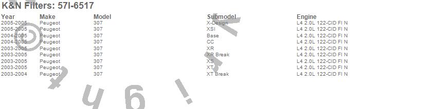 Below is an abbreviated list of applications for the 57i Series Induction Kit.307, Peugeot, 2005, 2004, 2003