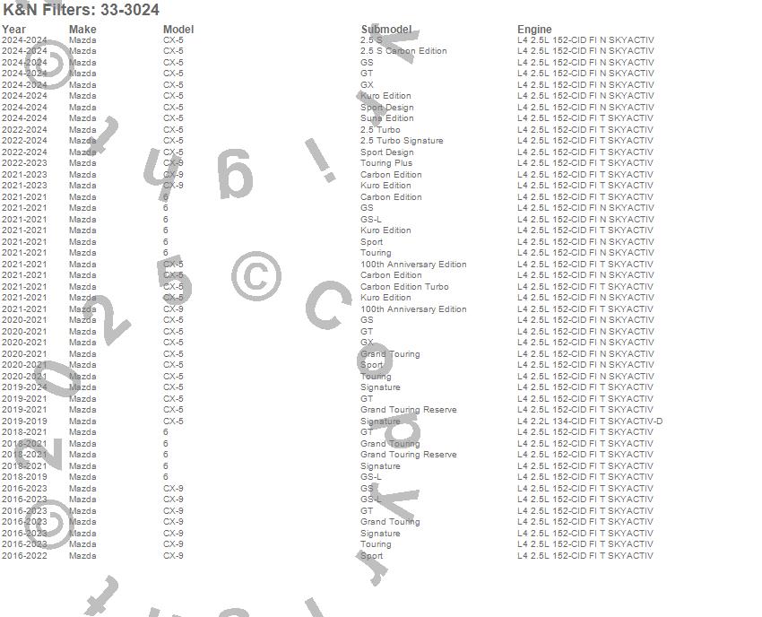 Below is an abbreviated list of applications for the Air Filter.6, CX-5, CX-9, Mazda, 2019, 2018, 2017, 2016