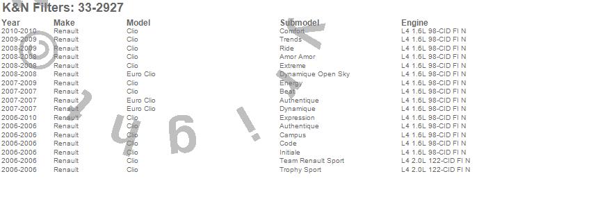 Below is an abbreviated list of applications for the Air Filter.Clio, Euro Clio, Renault, 2010, 2009, 2008, 2007, 2006