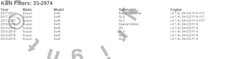 Below is an abbreviated list of applications for the Air Filter.Swift, Suzuki, 2017, 2016, 2015, 2014, 2013, 2012