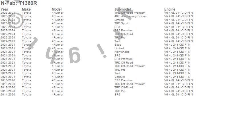 Below is an abbreviated list of applications for the Wheel To Wheel Nerf Step Bar.4Runner, Toyota, 2024, 2023, 2022, 2021, 2020, 2019, 2018, 2017, 2016, 2015, 2014