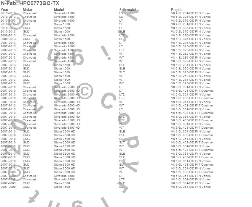 Below is an abbreviated list of applications for the Podium Step.Sierra 1500, Sierra 2500 HD, Sierra 3500 HD, Silverado 1500, Silverado 2500 HD, Silverado 3500 HD, Chevrolet, GMC, 2013, 2012, 2011, 2010, 2009, 2008, 2007