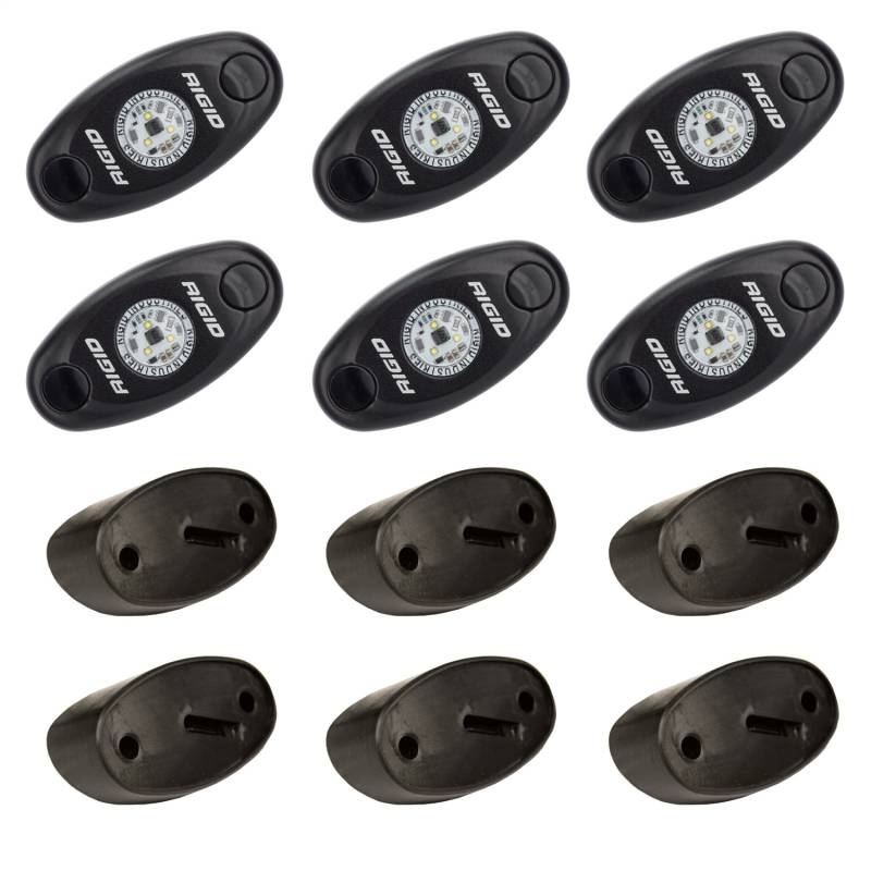 Buy this A-Series Rock Light Kit LED Rigid Industries 400253 Incl. 6 Lights w/15 ft. Leads - Mounting Pads - 8 ft. Wiring Harness - Distribution Block - Interior/Exterior - Cool White here at SVCustoms.com an authorized Rigid Industries Exterior LED dealer and distributor.