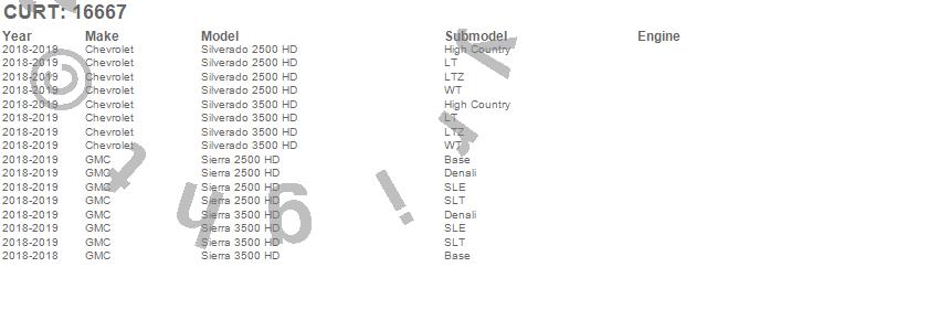 Brand: CURTPart Number: 16667Fifth Wheel Trailer Hitch Type: 16000 lbs. Capacity - 4000 lbs. Vertical Load - Incl. Roller - GM Puck System Adapter PN[16667]UPC: 612314042470