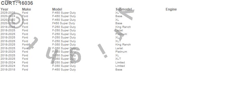 Brand: CURTPart Number: 16036Fifth Wheel Trailer Hitch Type: 25000 lbs Capacity - 6250 lbs. Vertical Load - Incl. Ford Puck System Legs PN[16036]UPC: 612314042937