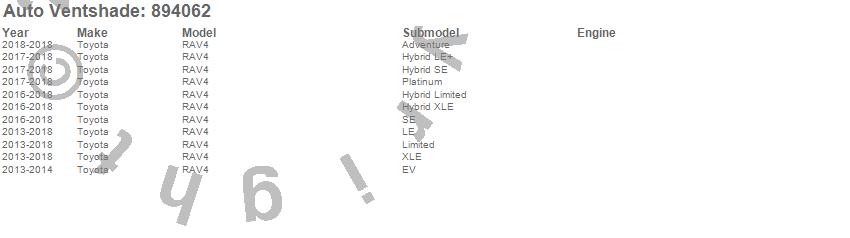 Below is an abbreviated list of applications for the Ventvisor Low Profile Deflector 4 pc..RAV4, Toyota, 2018, 2017, 2016, 2015, 2014, 2013