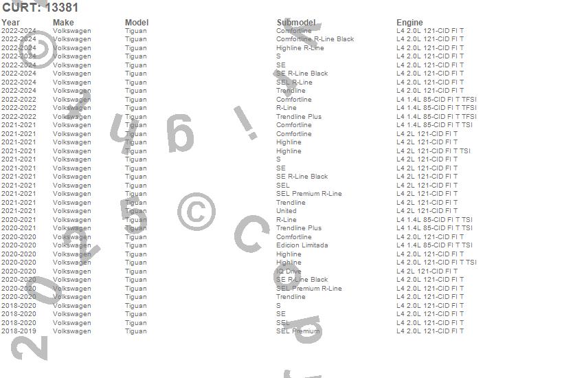 Below is an abbreviated list of applications for the Class III 2 in. Receiver Hitch.Tiguan, Volkswagen, 2024, 2023, 2022, 2021, 2020, 2019, 2018