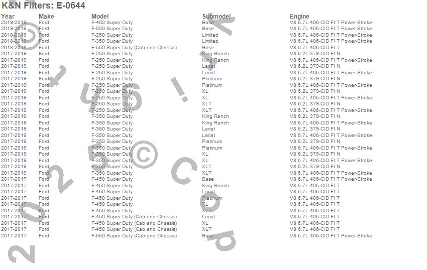 Below is an abbreviated list of applications for the Air Filter.F-250 Super Duty, F-350 Super Duty, F-450 Super Duty, F-550 Super Duty, Ford, 2019, 2018, 2017