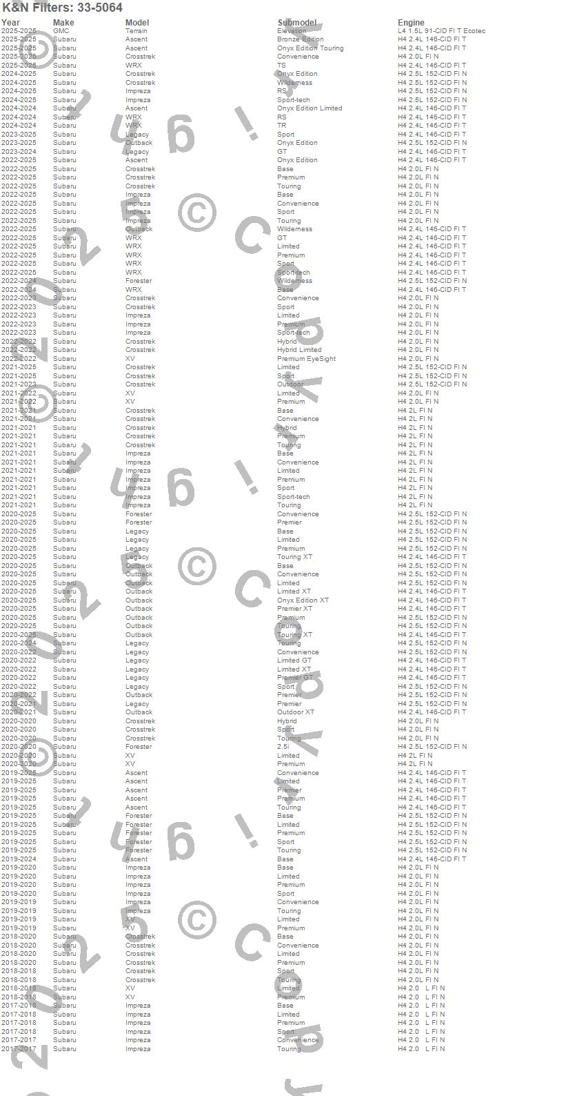 Below is an abbreviated list of applications for the Air Filter.Ascent, Crosstrek, Forester, Impreza, XV, Subaru, 2019, 2018, 2017