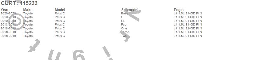 Below is an abbreviated list of applications for the Class I 1.25 in. Receiver Hitch.Prius C, Toyota, 2020, 2019, 2018