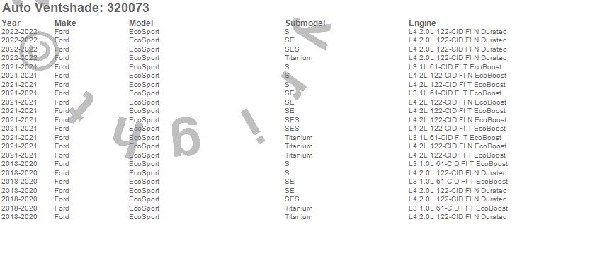 Below is an abbreviated list of applications for the Aeroskin Smoke Hood Protector.EcoSport, Ford, 2022, 2021, 2020, 2019, 2018
