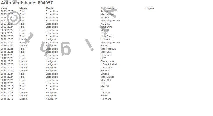 Below is an abbreviated list of applications for the Ventvisor Low Profile Deflector 4 pc..Expedition, Navigator, Ford, Lincoln, 2025, 2024, 2023, 2022, 2021, 2020, 2019, 2018