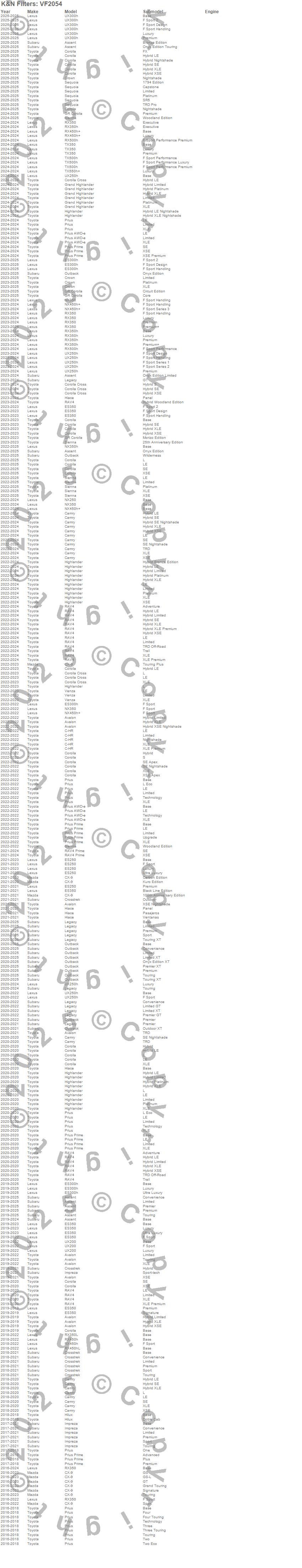 Below is an abbreviated list of applications for the Cabin Air Filter.Ascent, Avalon, Camry, Corolla, Crosstrek, CX-9, ES350, Hilux, Impreza, Prius, Prius Prime, RAV4, RX350, RX350L, RX450h, RX450hL, UX200, Lexus, Mazda, Subaru