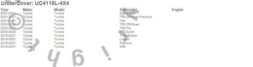 Brand: UnderCoverPart Number: UC4118L-4X4Tonneau Cover Type: Vintage Brown - Paint Code 4X4UPC: 816391024187