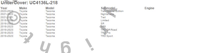 Brand: UnderCoverPart Number: UC4136L-218Tonneau Cover Type: Attitude Black - Paint Code 218UPC: 816391024279