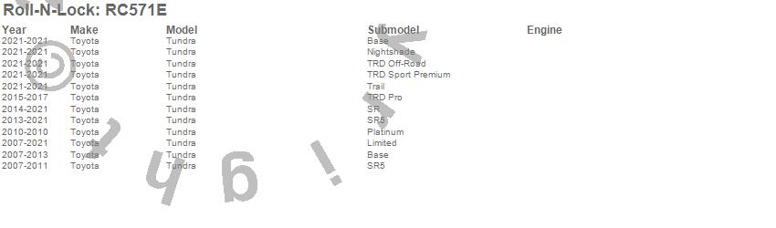 Below is an abbreviated list of applications for the Roll-N-Lock E-Series Tonneau Cover.Tundra, Toyota, 2021, 2020, 2019, 2018, 2017, 2016, 2015, 2014, 2013, 2012, 2011, 2010, 2009, 2008, 2007