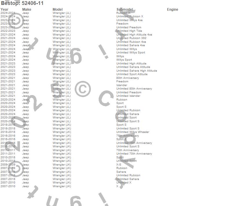 Below is an abbreviated list of applications for the Retractable Sunshade.Wrangler (JK), Wrangler (JL), Jeep, 2024, 2023, 2022, 2021, 2020, 2018, 2017, 2016, 2015, 2014, 2013, 2012, 2011, 2010, 2009, 2008, 2007