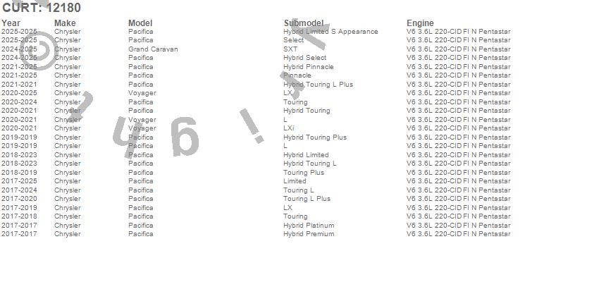 Below is an abbreviated list of applications for the Class II 1.25 in. Receiver Hitch.Grand Caravan, Pacifica, Voyager, Chrysler, 2026, 2025, 2024, 2023, 2022, 2021, 2020, 2019, 2018, 2017