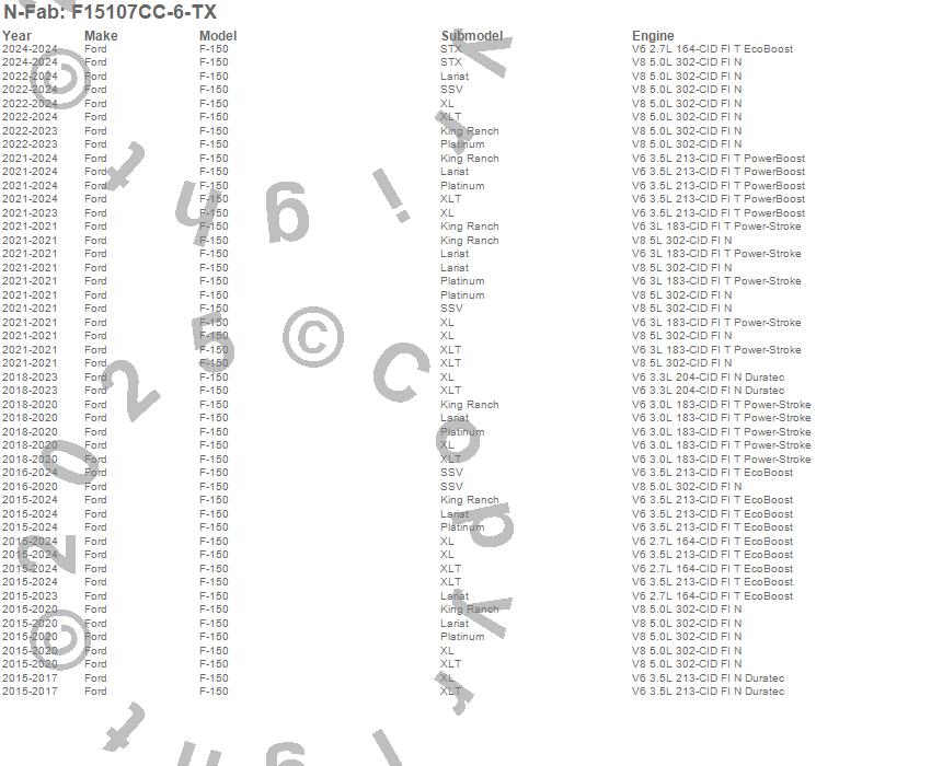 Brand: N-FabPart Number: F15107CC-6-TXNerf/Step Bar (Wheel to Wheel) Type: 6 Step - 3 in. .084 Main Tube - 465 lb. Load Rating - Textured Black - Special OrderUPC: 843206109944