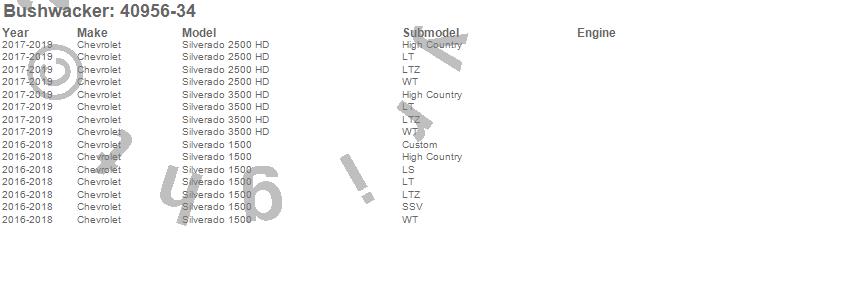Brand: BushwackerPart Number: 40956-34Fender Flare Type: 4 pc. - Front Tire Coverage .75 in. - Front Height 3.5 in. - Rear Tire Coverage .75 in - Rear Height 4 in. - Smooth Finish - Factory Style - BlackUPC: 090689121554