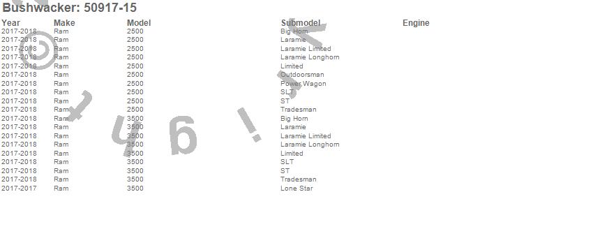 Brand: BushwackerPart Number: 50917-15Fender Flare Type: 4 pc. - Front Tire Coverage .5 in. - Front Height 4 in. - Rear Tire Coverage .5 in - Rear Height 4 in. - Bright White Clear CoatUPC: 090689121585