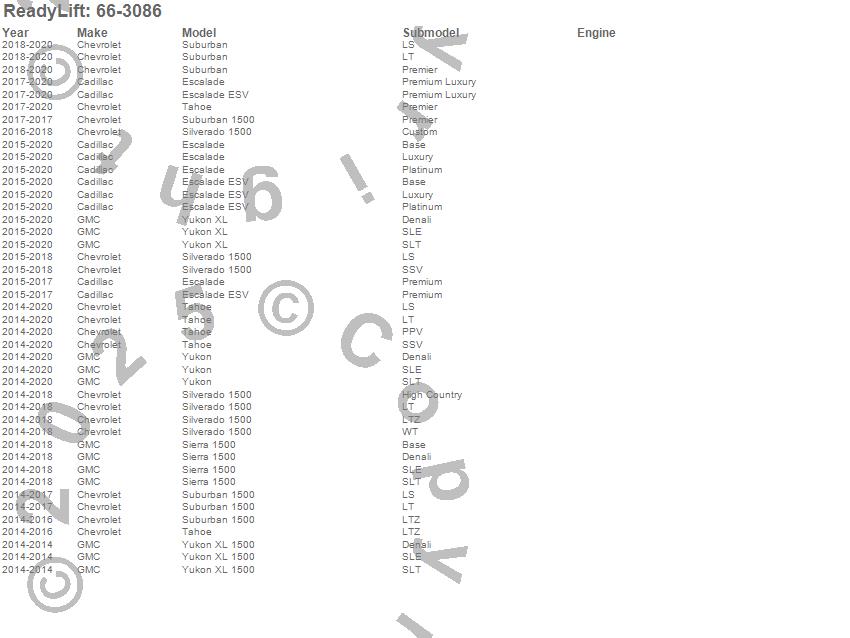 Below is an abbreviated list of applications for the Front Leveling Kit.Escalade, Escalade ESV, Sierra 1500, Silverado 1500, Suburban, Suburban 1500, Tahoe, Yukon, Yukon XL, Yukon XL 1500, Cadillac, Chevrolet, GMC, 2020, 2019, 2018, 2017, 2016, 2015, 2014
