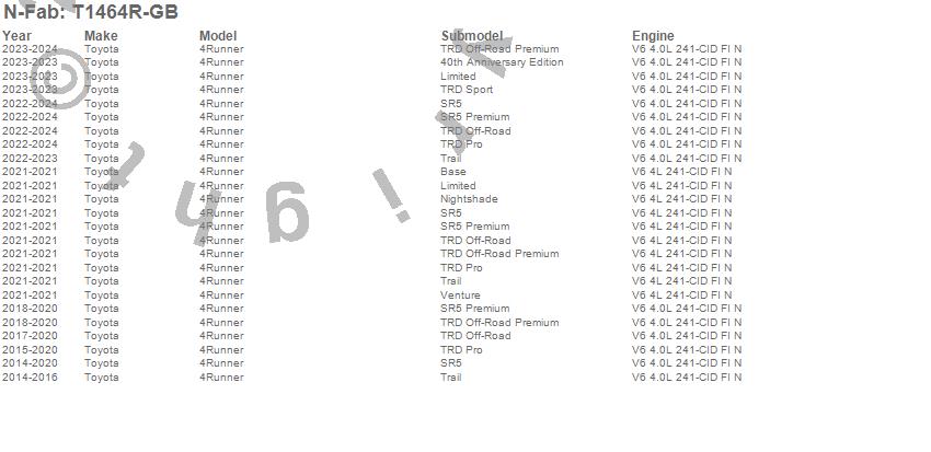 Below is an abbreviated list of applications for the Wheel To Wheel Nerf Step Bar.4Runner, Toyota, 2024, 2023, 2022, 2021, 2020, 2019, 2018, 2017, 2016, 2015, 2014