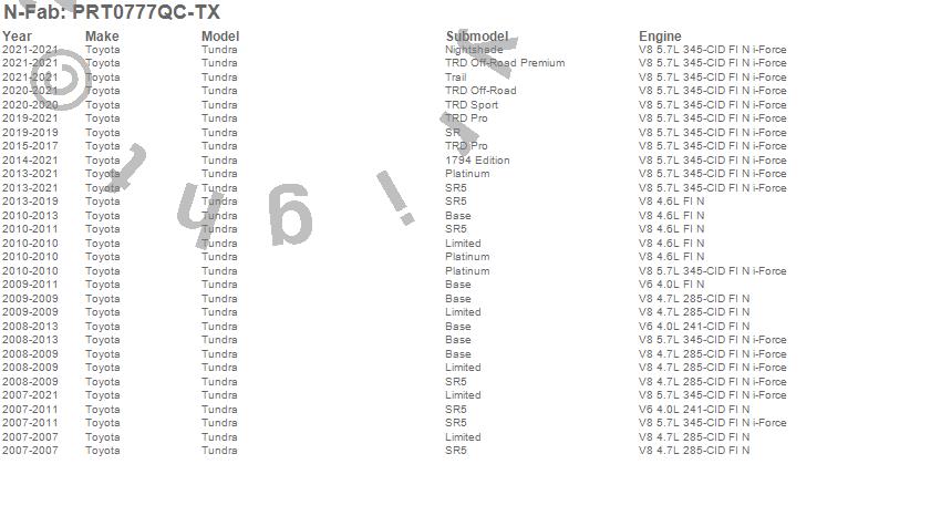 Below is an abbreviated list of applications for the Predator Pro Cab Length Step.Tundra, Toyota, 2021, 2020, 2019, 2018, 2017, 2016, 2015, 2014, 2013, 2012, 2011, 2010, 2009, 2008, 2007
