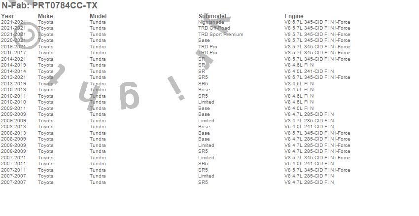 Below is an abbreviated list of applications for the Predator Pro Cab Length Step.Tundra, Toyota, 2021, 2020, 2019, 2018, 2017, 2016, 2015, 2014, 2013, 2012, 2011, 2010, 2009, 2008, 2007