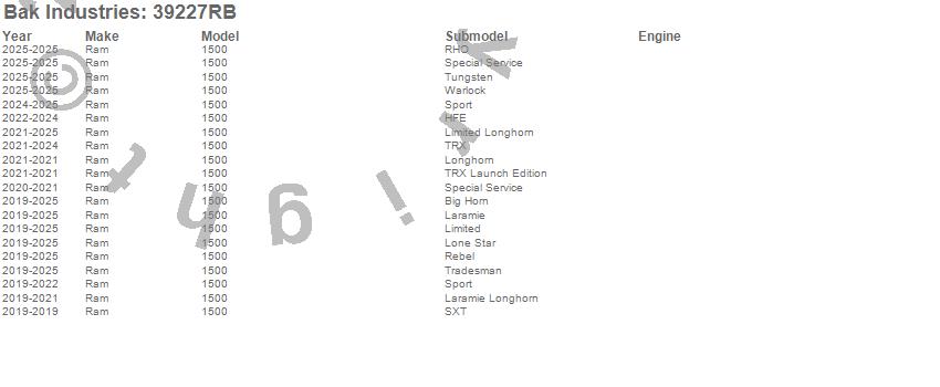 Brand: BAK IndustriesPart Number: 39227RBTonneau Cover Type: Black - Vinyl Top w/ Aluminum Underside - Leather Grain FinishUPC: 819275050630