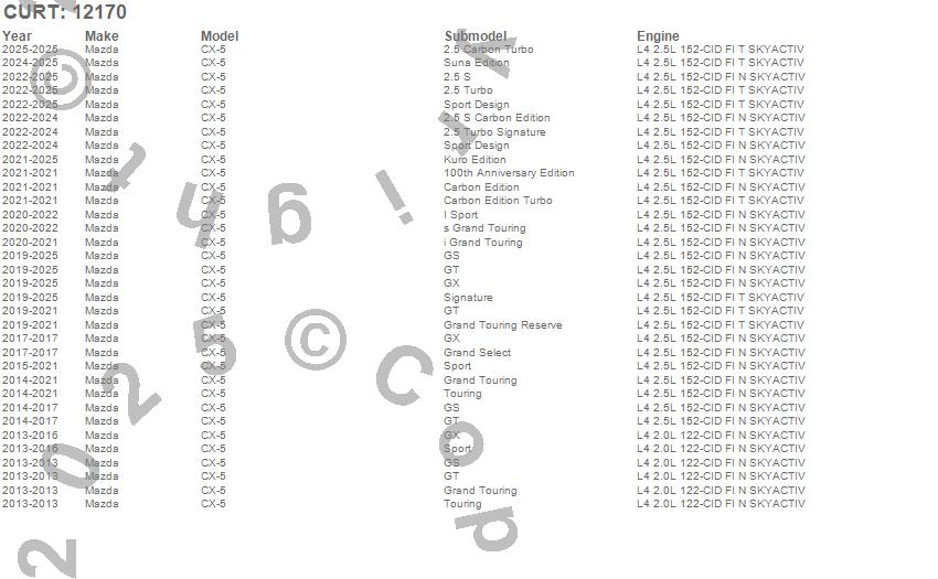 Below is an abbreviated list of applications for the Class II 1.25 in. Receiver Hitch.CX-5, Mazda, 2025, 2024, 2023, 2022, 2021, 2020, 2019, 2018, 2017, 2016, 2015, 2014, 2013