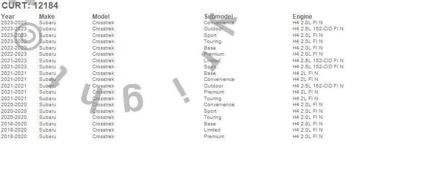 Below is an abbreviated list of applications for the Class II 1.25 in. Receiver Hitch.Crosstrek, Subaru, 2023, 2022, 2021, 2020, 2019, 2018