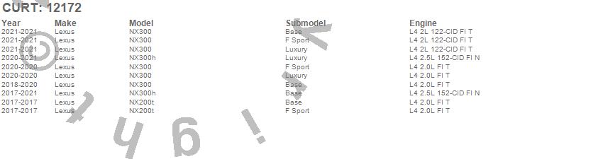 Below is an abbreviated list of applications for the Class II 1.25 in. Receiver Hitch.NX200t, NX300, NX300h, Lexus, 2021, 2020, 2019, 2018, 2017