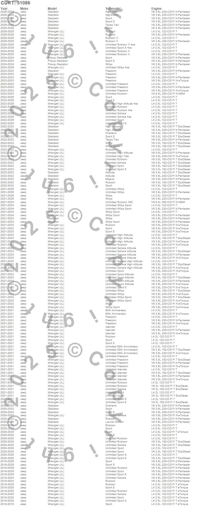 Below is an abbreviated list of applications for the 2 in. Receiver Hitch.Gladiator, Pickup Gladiator, Wrangler (JL), Jeep, 2025, 2024, 2023, 2022, 2021, 2020, 2019, 2018